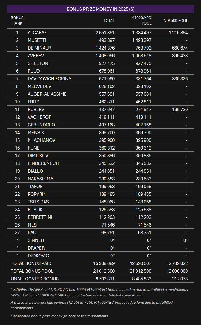 虎扑12月24日讯ATP年度的分红明细出炉,具体如下: