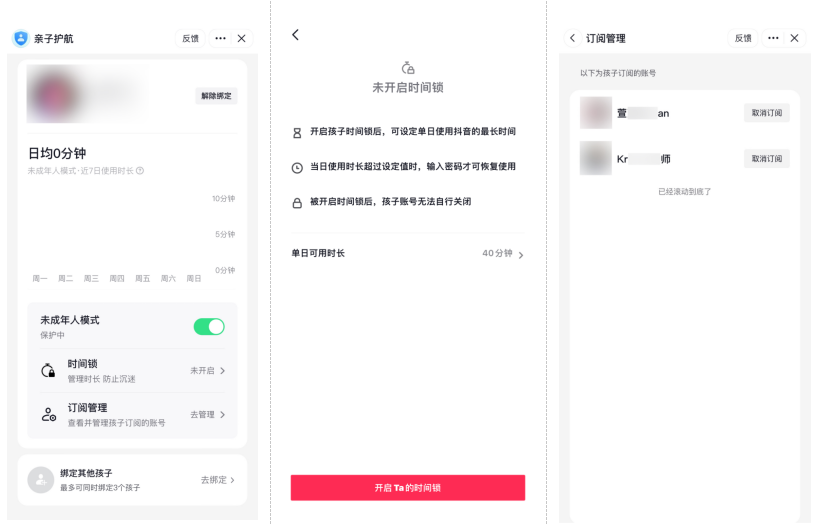 围绕家庭监护的实际需求,抖音为家长提供三项协同能力:一是模式灵活切换,可按需开关未成年人模式,匹配孩子不同年龄阶段的上网场景;二是时长智能管控,不仅能查看近7天内特定范围的使用记录、设置单日使用时长上限(超时需家长解锁),还能自动开启夜间“防沉迷守护”,每日22时至次日6时强制关闭使用权限;三是协助管理订阅账号,可查看并管理孩子在未成年人模式下订阅的创作者列表,引导孩子选择适龄优质内容。