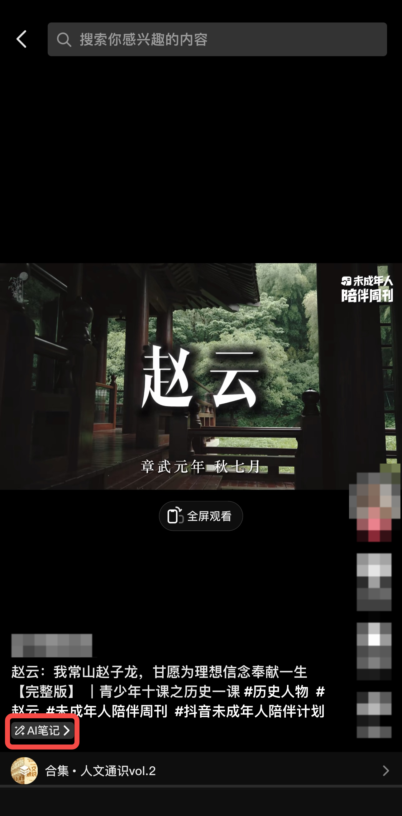 知识科普类内容“AI笔记”功能按钮